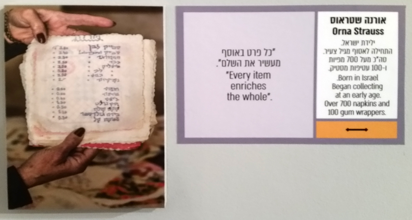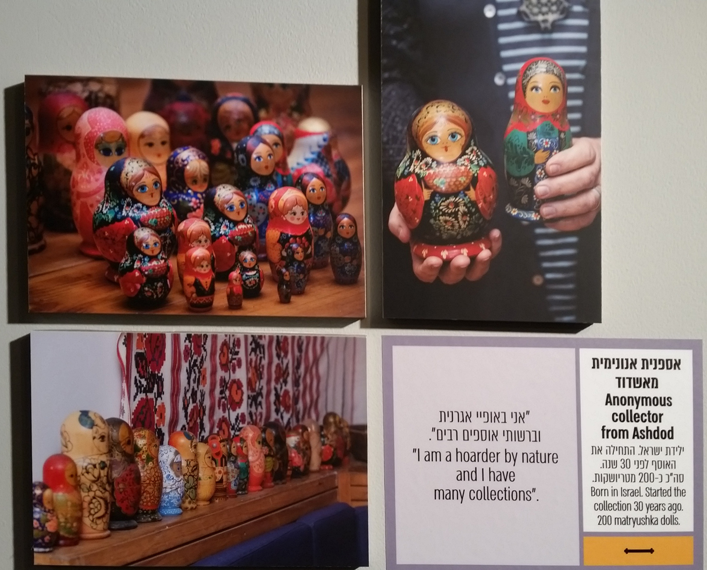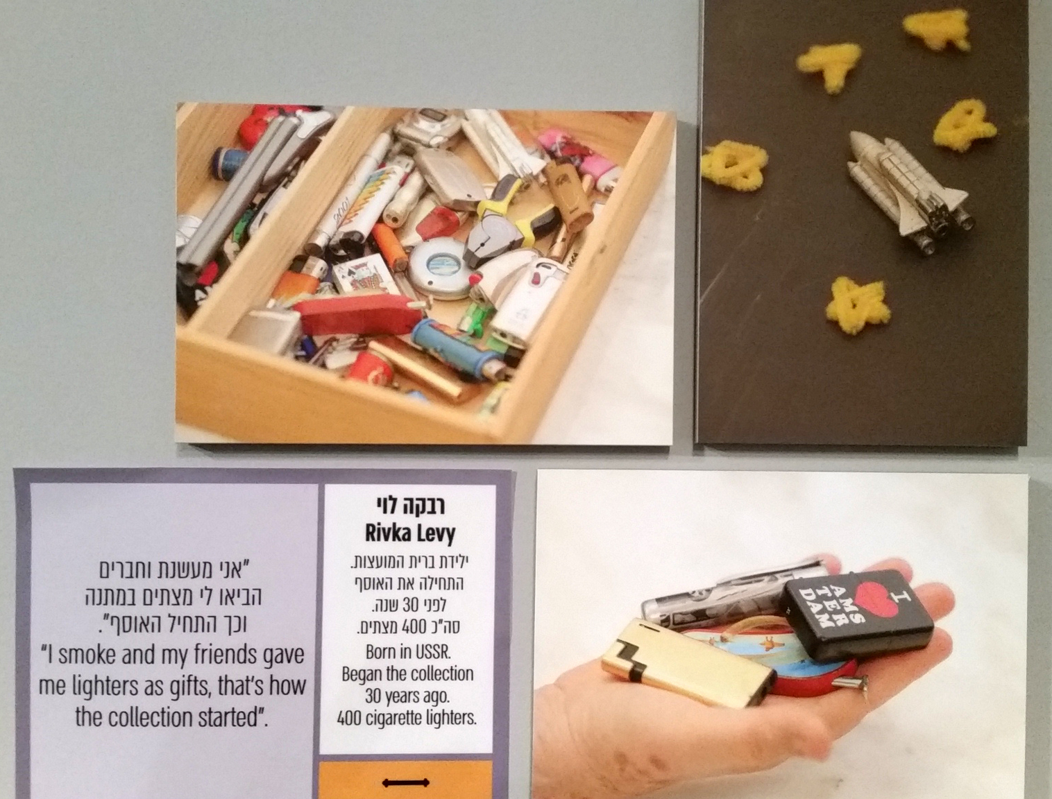 התערוכה מאוד צבעונית ומיוחדת, כל אחד יכול להתחבר אליה מבוגרים וצעירים, אספנים וגם מי שאינו אספן. לפי דבריה של אוצרת התערוכה יעל ויזל, זוהי אחת התערוכות המאתגרות שהיו לה. אפילו בעיצוב של התערוכה הושקעה מחשבה רבה מצד המעצבים. לכל אוסף המוצג בתערוכה יש את הקסם האישי שלו. אם אינכם אספנים אז ביקור בתערוכה זו עשוי לעודד אתכם להתחיל לאסוף או שפשוט ליהנות מיופייה של התערוכה ואף לעלות זיכרונות מן העבר על סמך הפריטים המוצגים בה. פתיחה רשמית של התערוכה תתקיים בתאריך 22.04.18 בשעה 18:00.